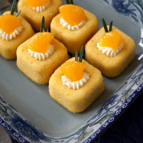 If you’re having a party and need that perfect after dinner treat, look no further! Our Orange Almond petit four are light and refreshing. Each slice comes with a dollop of cream cheese, mandarin slice and some rosemary for savoury note. Perfect for parties and even as a gift.