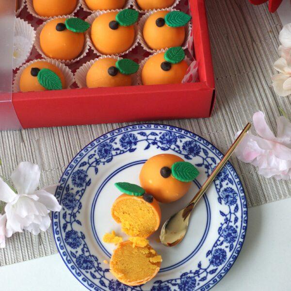 Orange butter cake pops that look like mini oranges! These make a cute gift or bring along for CNY Reunions. Each pop is orange buttercake rolled and dipped in chocolate.